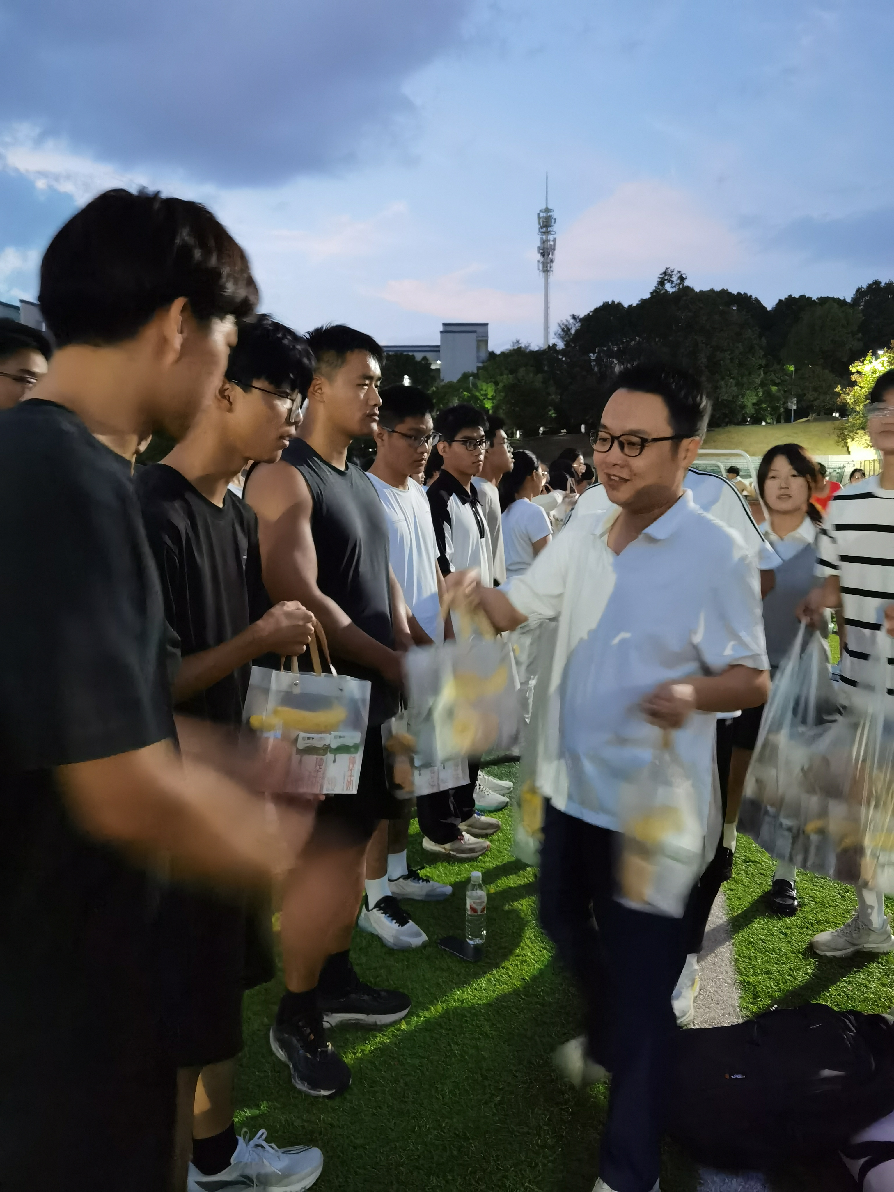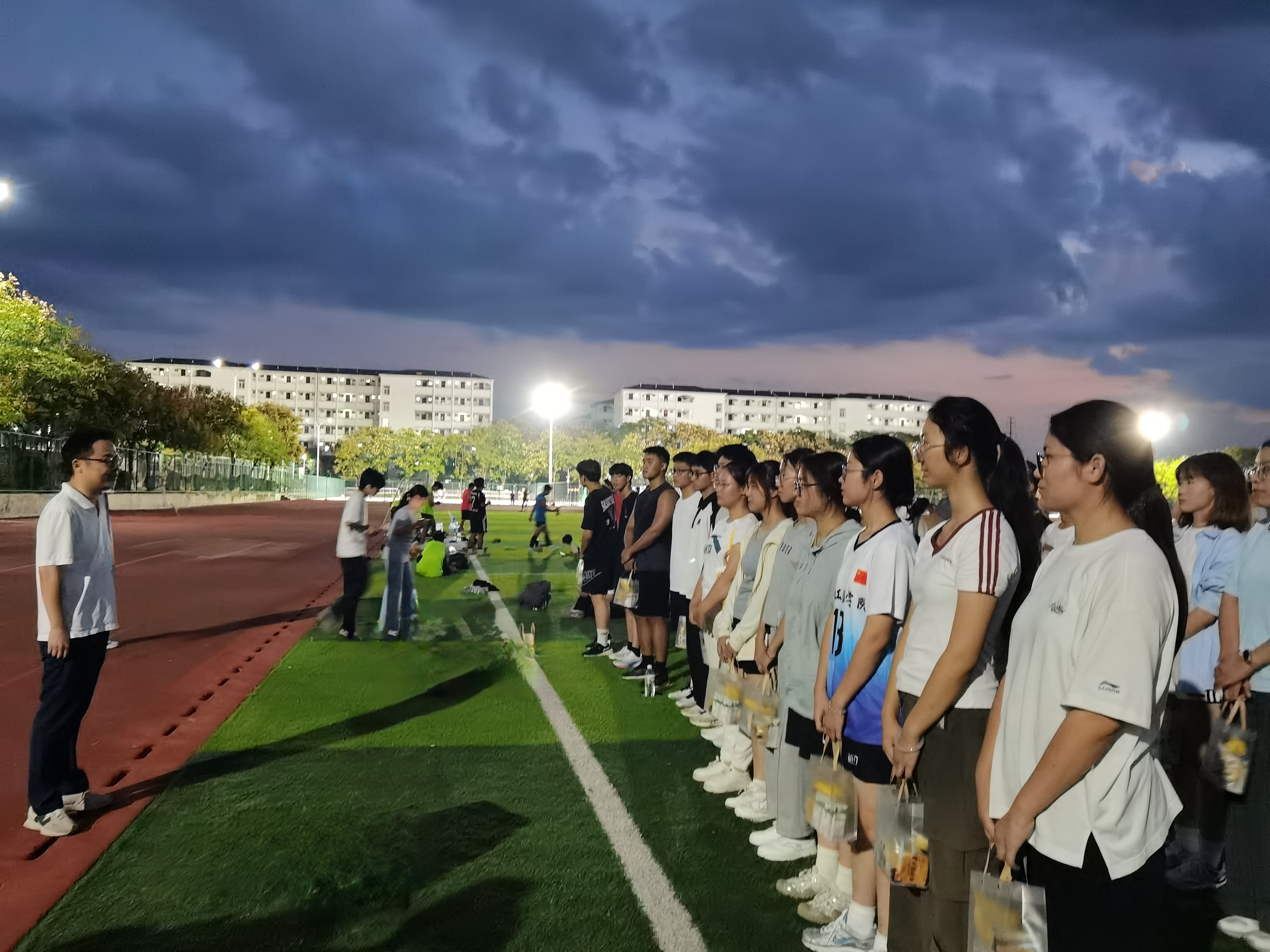 在操场灯光下,学院领导观摩了整体训练情况。队员们精神饱满,训练投入。学院副院长曹海,与队长们亲切交流,详细了解训练安排和备战进度。