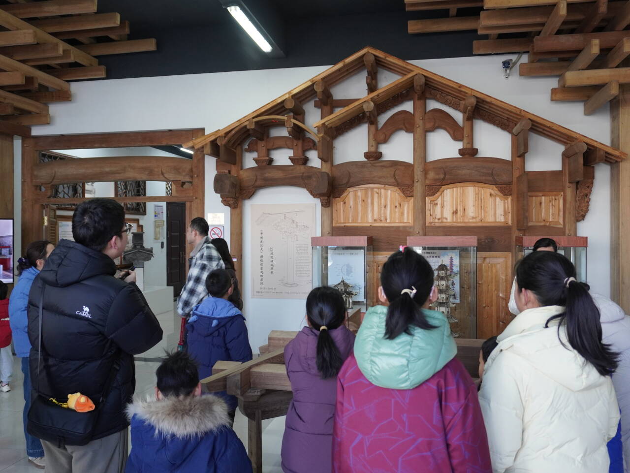 活动伊始,参与家庭分为两组,在建筑学党支部志愿者的专业引导下开启平行参观,展开多层次、全方位的文化探索。一组步入一楼展厅,中国建筑史模型成果展;模型构建区的激光切割与雕刻机现场演示引得大家驻足围观,志愿者细致详解现代科技对传统建筑模型制作的赋能与助力,让亲子家庭直观感受科技与传统的碰撞融合。另一组在二楼徽派建筑模型展厅溯源文化根脉,村落园林、祠堂民居、雕刻构件三大展区系统呈现徽派建筑的营造技艺与深厚文化内涵。志愿者在三雕模型前,结合社区周边传统建筑实例,生动解读其兼具实用价值与美学追求的设计理念;紧邻的学生设计课程作业展区,则直观展现了学子们的创新设计思考力,为亲子家庭带来别样启发。